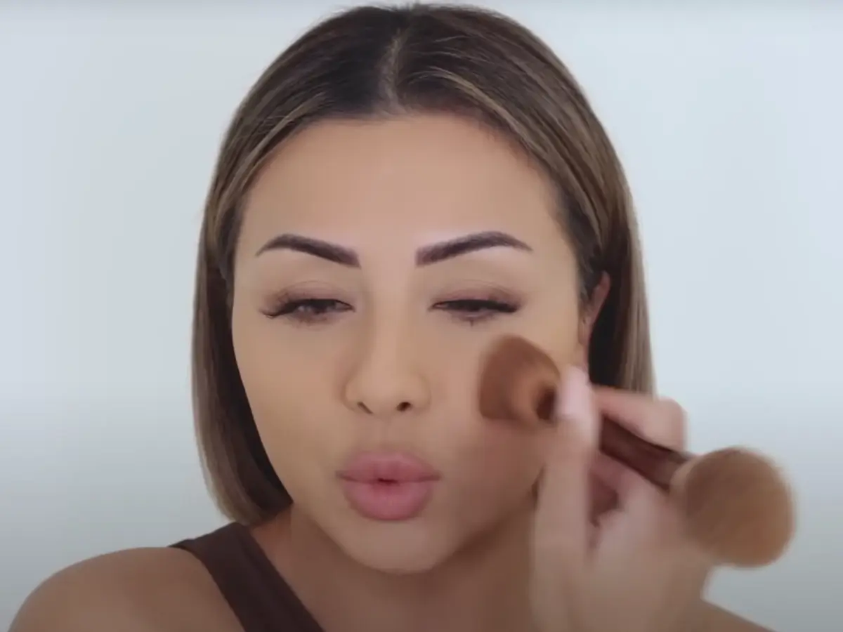 So just start out with applying bronzer on your cheeks and the temples of your face and if you would like under the neck to kind of define your jawline. Then were going to apply blush and the best blush colors that go with a bronzed look are like a peachy pink coral colors.