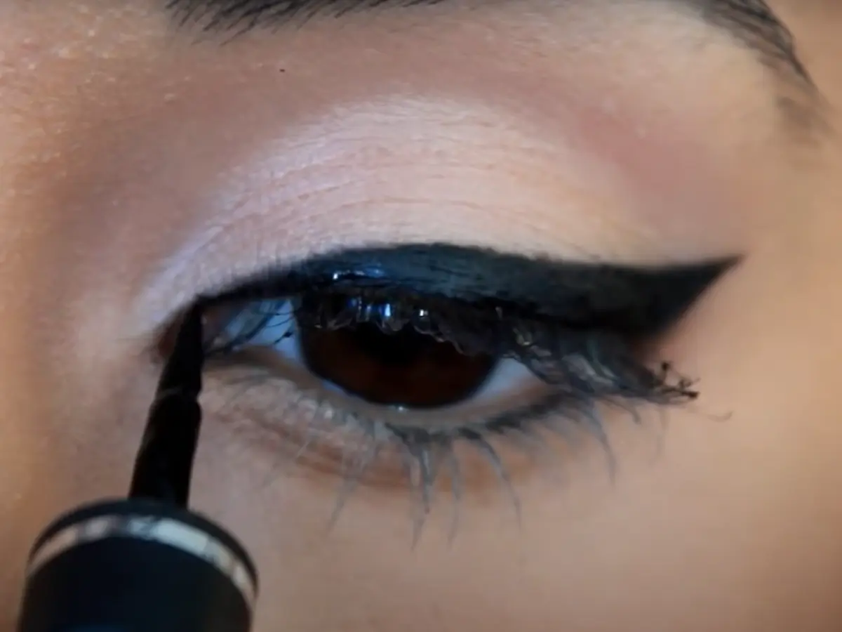 Start from the middle and then work your way outward. Have the brush angled instead of straight for easier application. Use your bottom lashes as a guide to where you want your wing to start then just flick it out and then fill in. If you find it hard to flick it out in a clean line use tape to help. To help intensify the look even more go over the liner with a liquid eyeliner. Once you are done with that your look is complete.